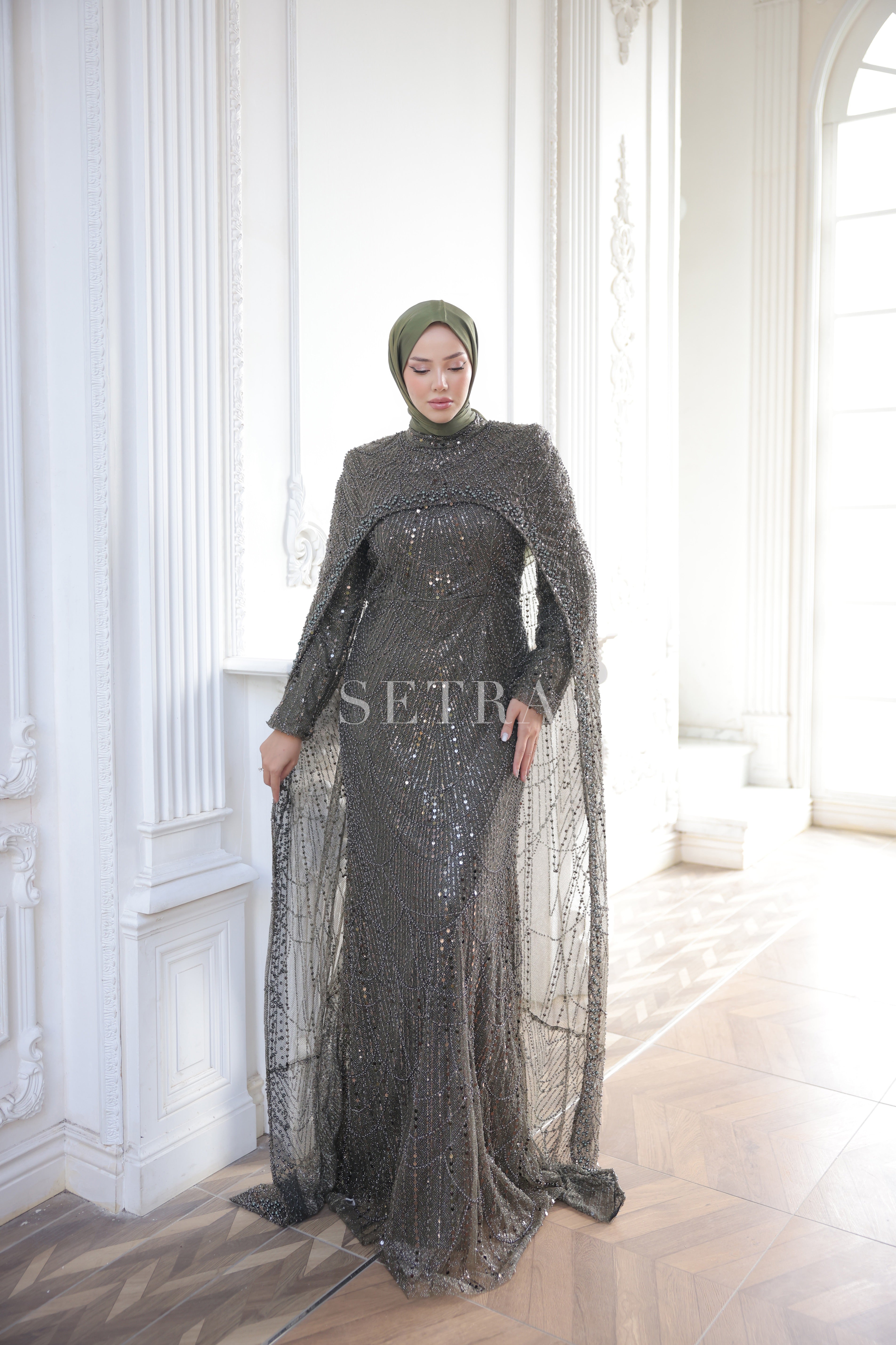 Özel Tasarım Pelerinli Abiye – Işıltılı Zeytin Yeşili