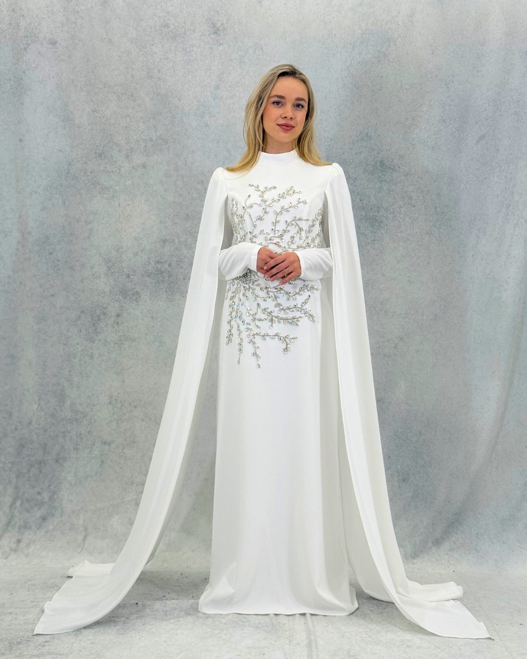 Taş İşlemeli Pelerin Kollu Uzun Abiye Elbise