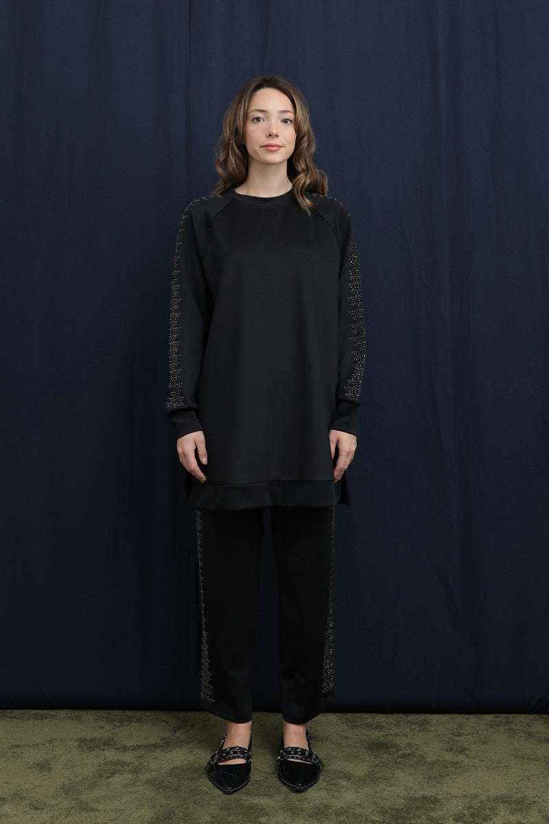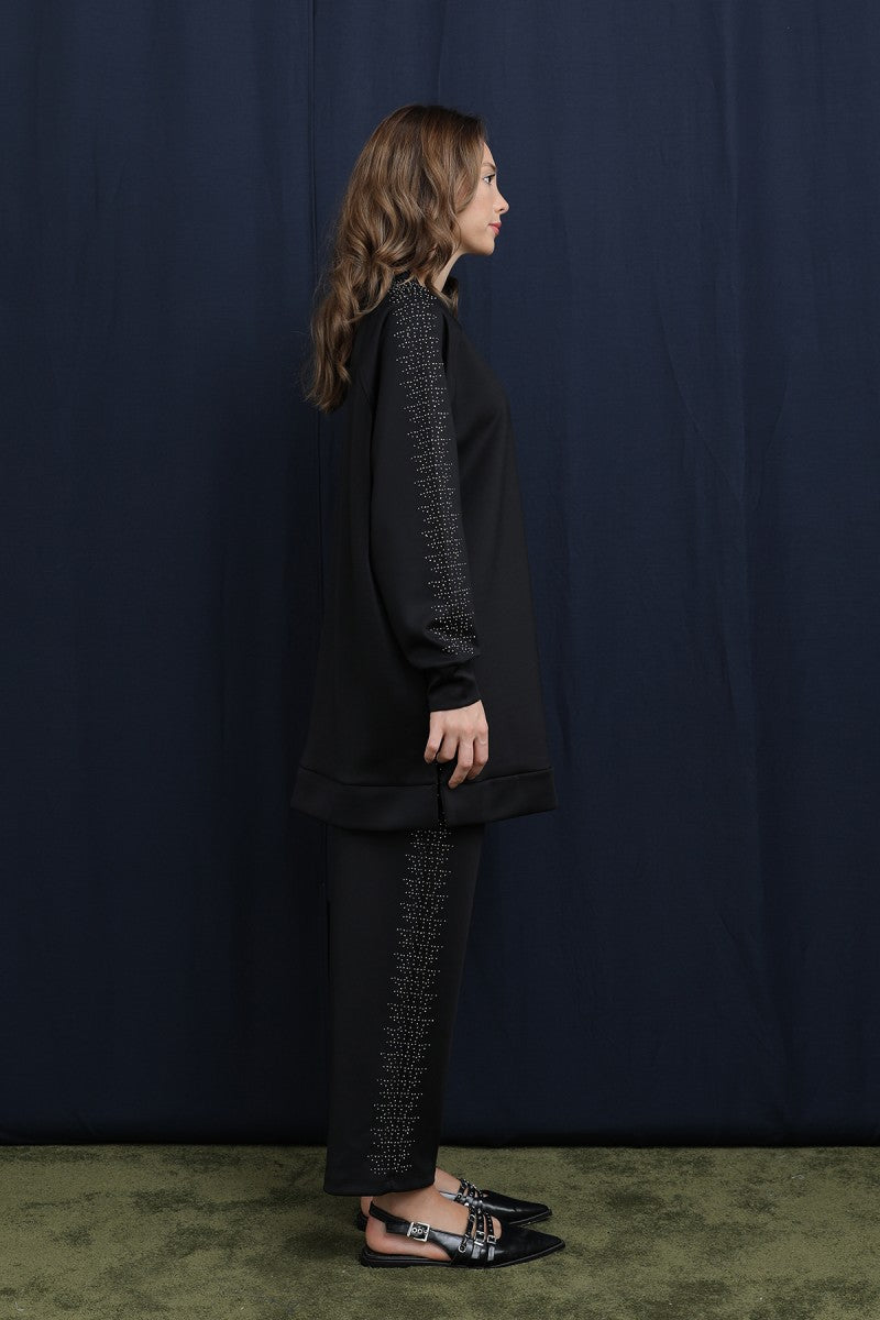 Taş detaylarıyla basic şıklığa zarif bir ışıltı katan bu takım, modern çizgisi ve rahat kalıbıyla dikkat çeker. Günlük şıklık için ideal olan tasarımı, şehirli bir stil arayanlara hitap eder.2614394