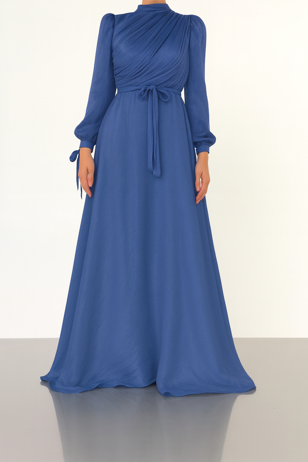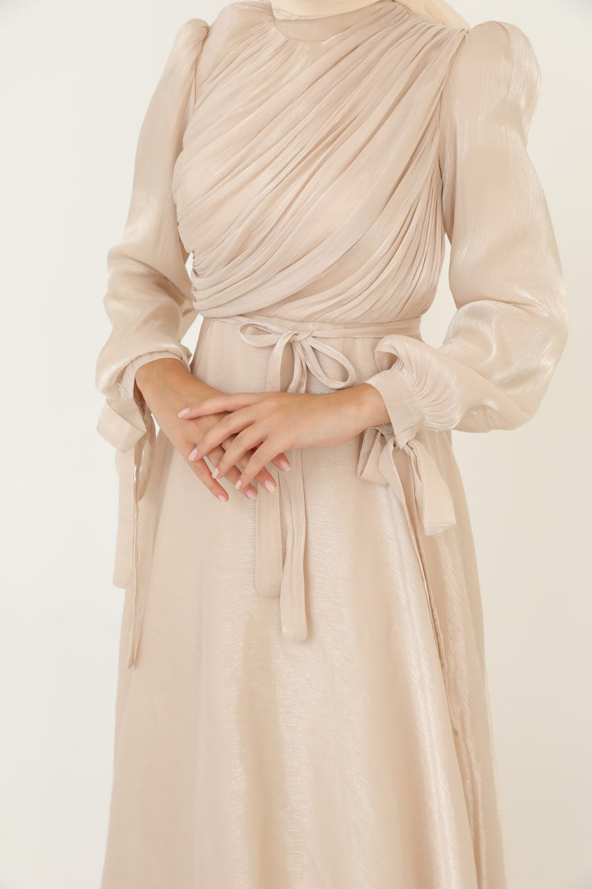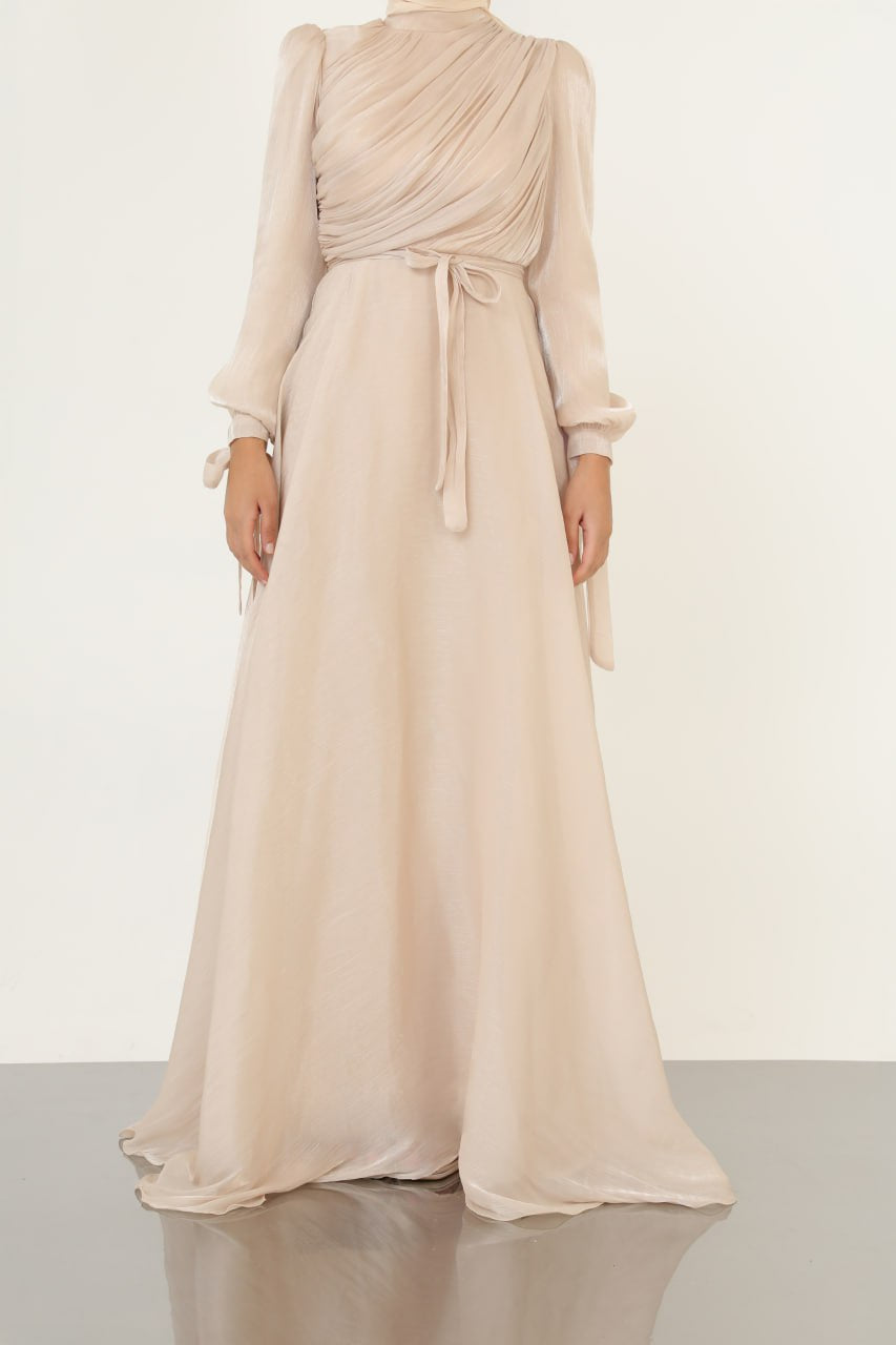 Etkileyici detaylarla tasarlanan bu özel elbise, güçlü duruşuyla her ortamda dikkatleri üzerine çeker. Bel kısmındaki drapeli yapısı vücut hatlarını kusursuzca sararken, omuzdan bileklere kadar boru formunda geniş şekilde inen kol detayı elbiseye ihtişamlı bir hava katıyor. Hafif transparan ve akıcı kumaşı sayesinde her adımda zarafetinizi yansıtır. Davet, nişan ve özel organizasyonlar için mükemmel bir seçim.
