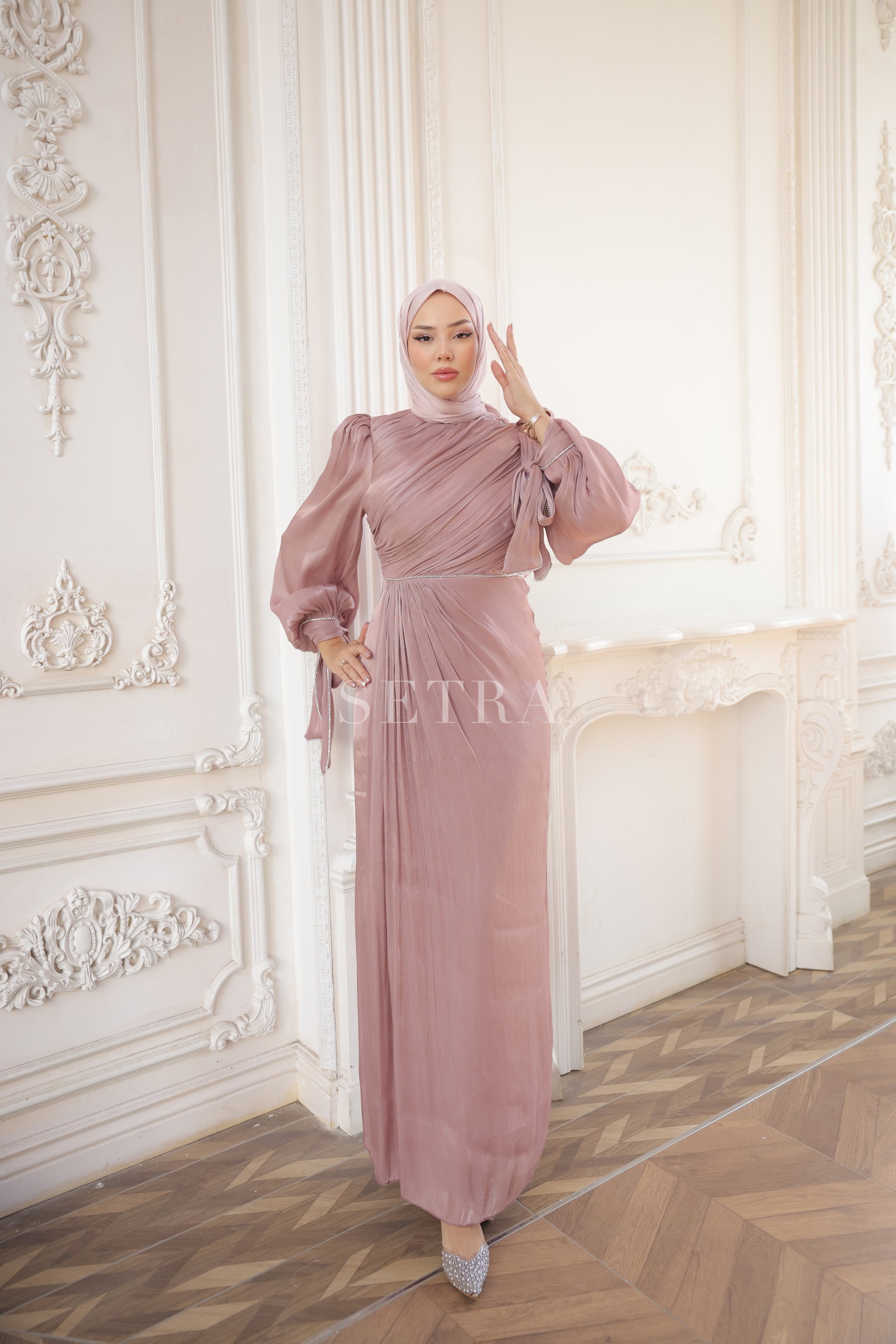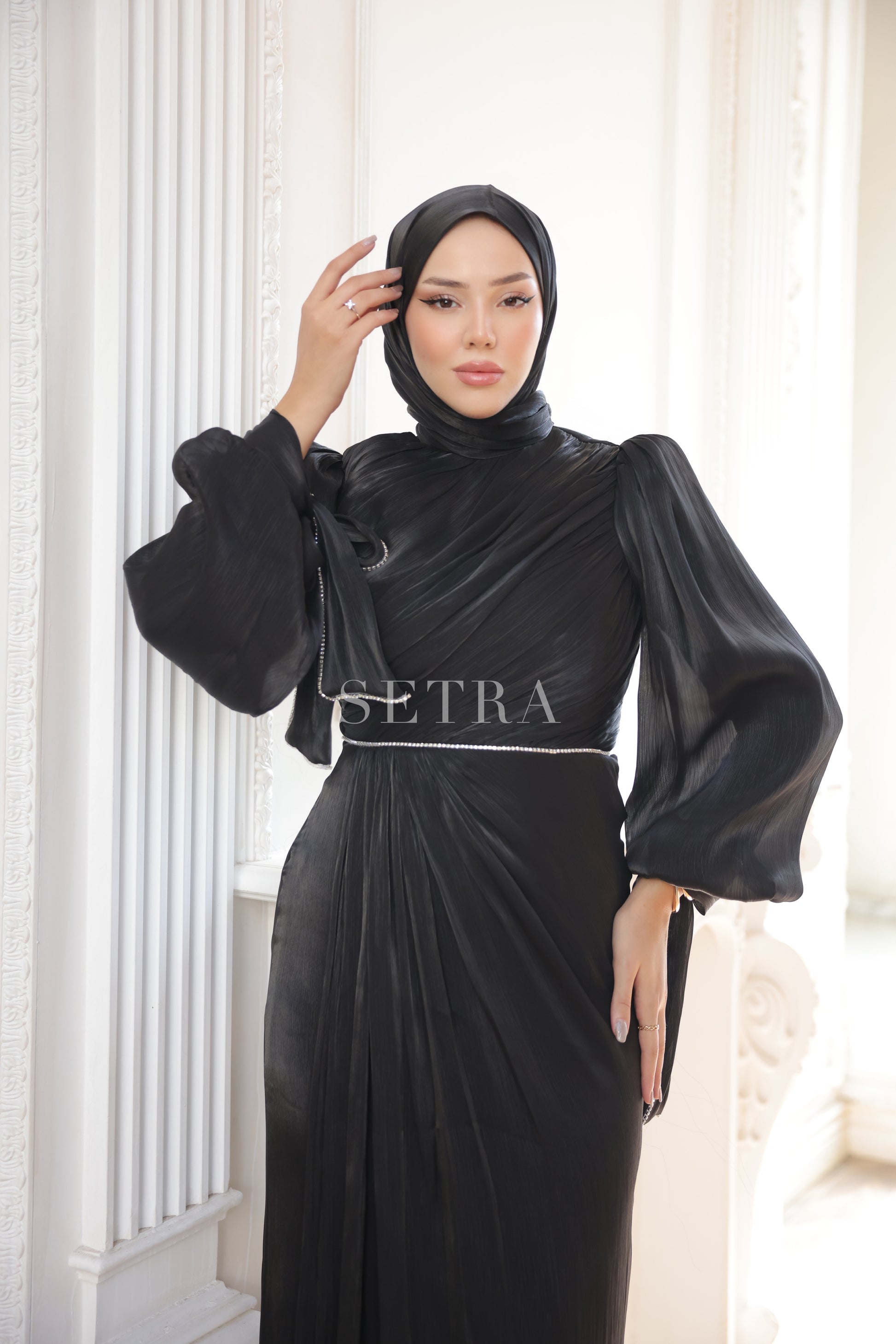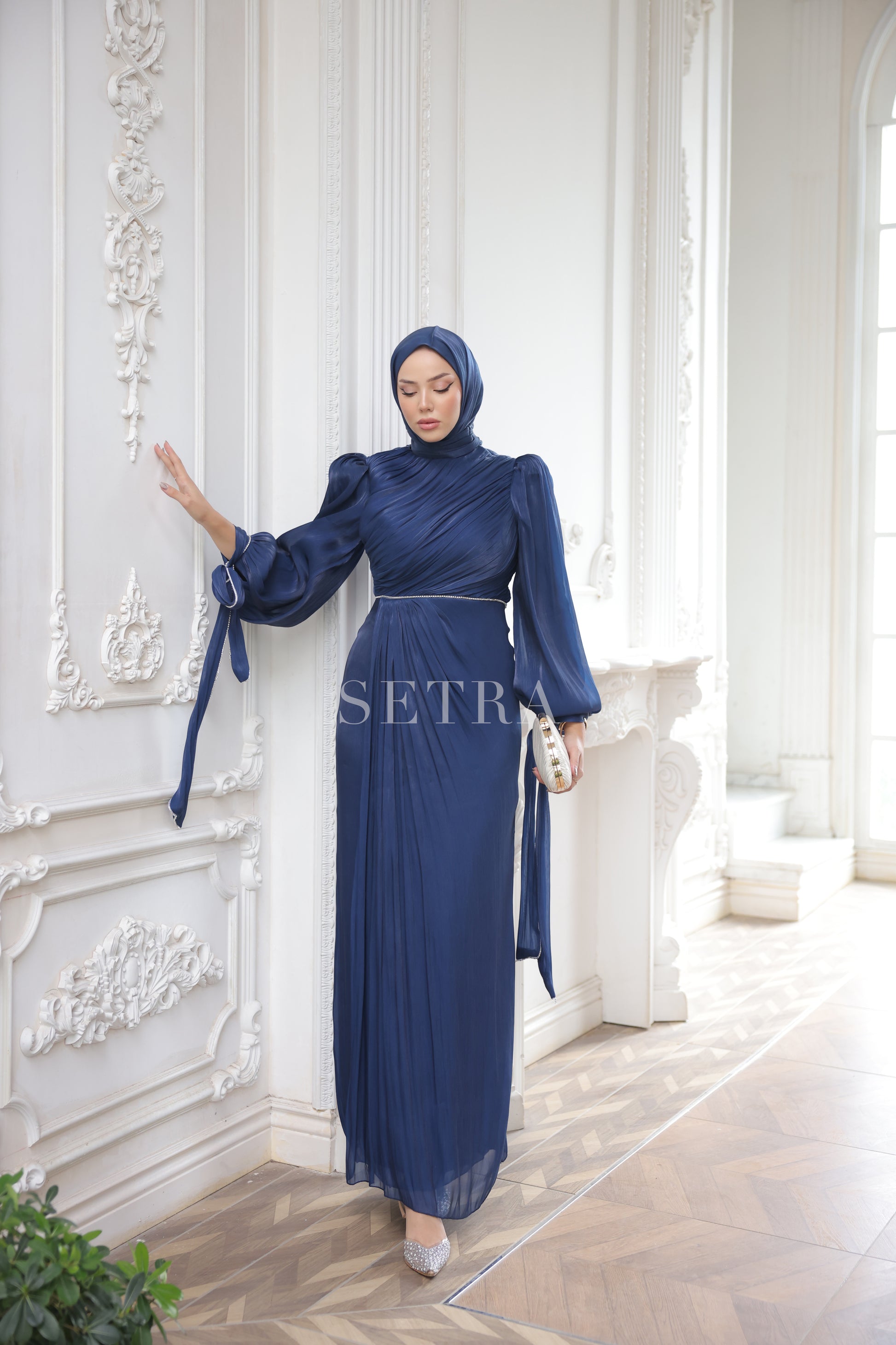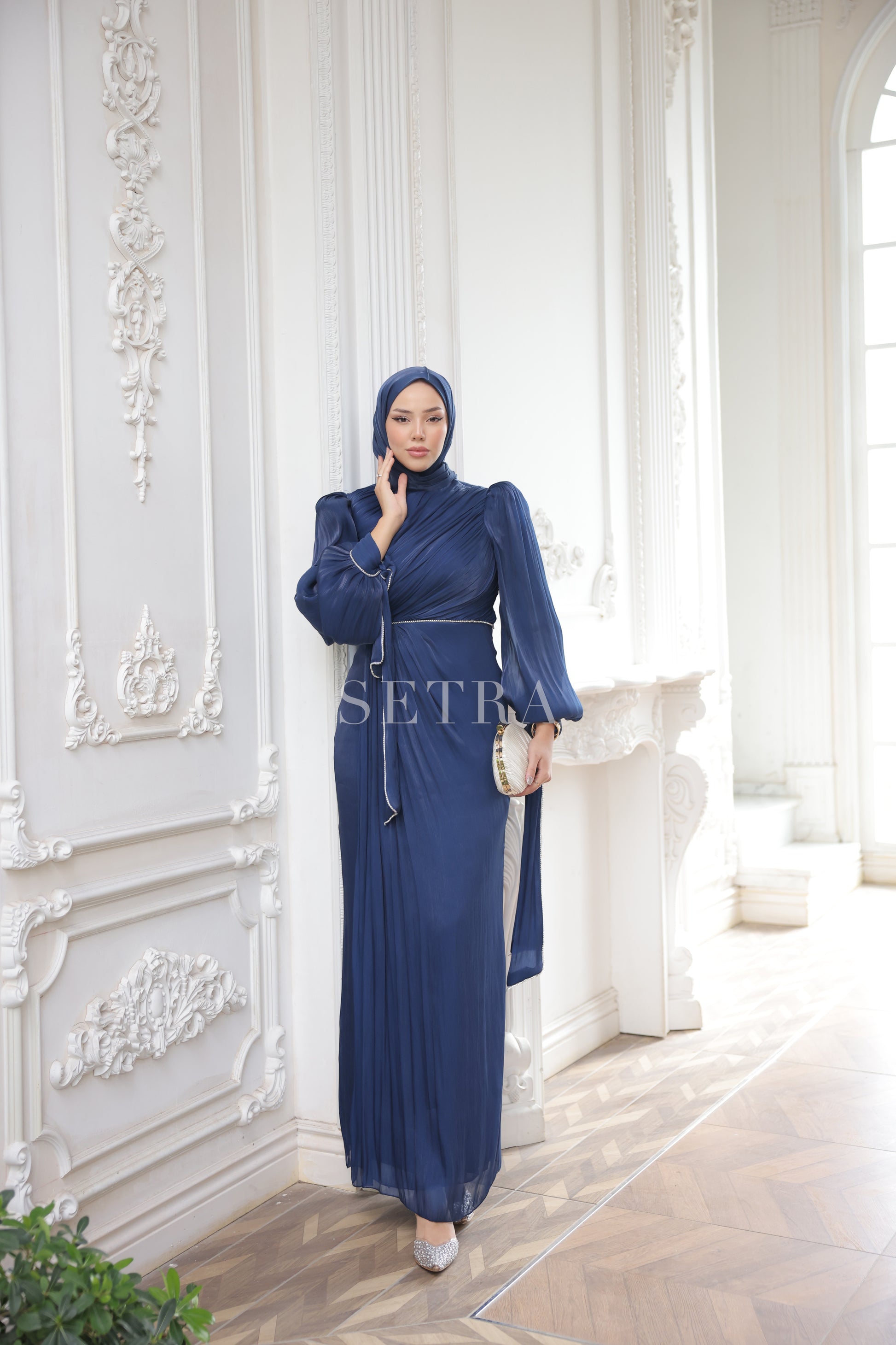 Şıklığı ve konforu bir araya getiren bu tesettür abiye elbise, özel günleriniz için zarif bir tercih sunuyor. Pileli ve akıcı kumaşı modern bir görünüm sağlarken, bel kısmındaki kuşak detayı vücut hatlarını zarifçe ön plana çıkarıyor. Uzun kollu ve kapalı yaka tasarımıyla tesettür modasına uygun olan bu abiye, düğün, nişan, davet ve tüm özel kutlamalarda stilinizi tamamlayacak göz alıcı bir parçadır.
