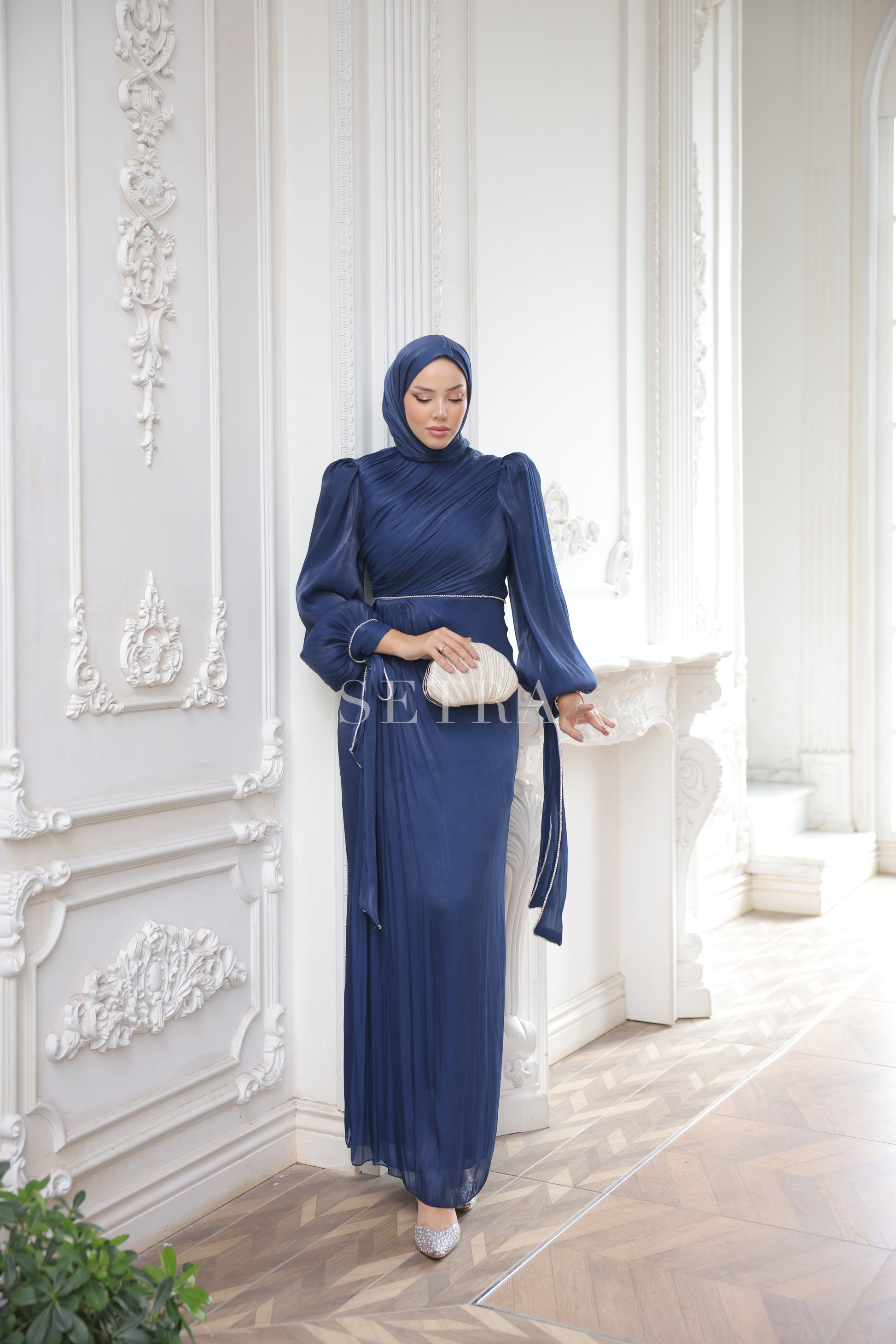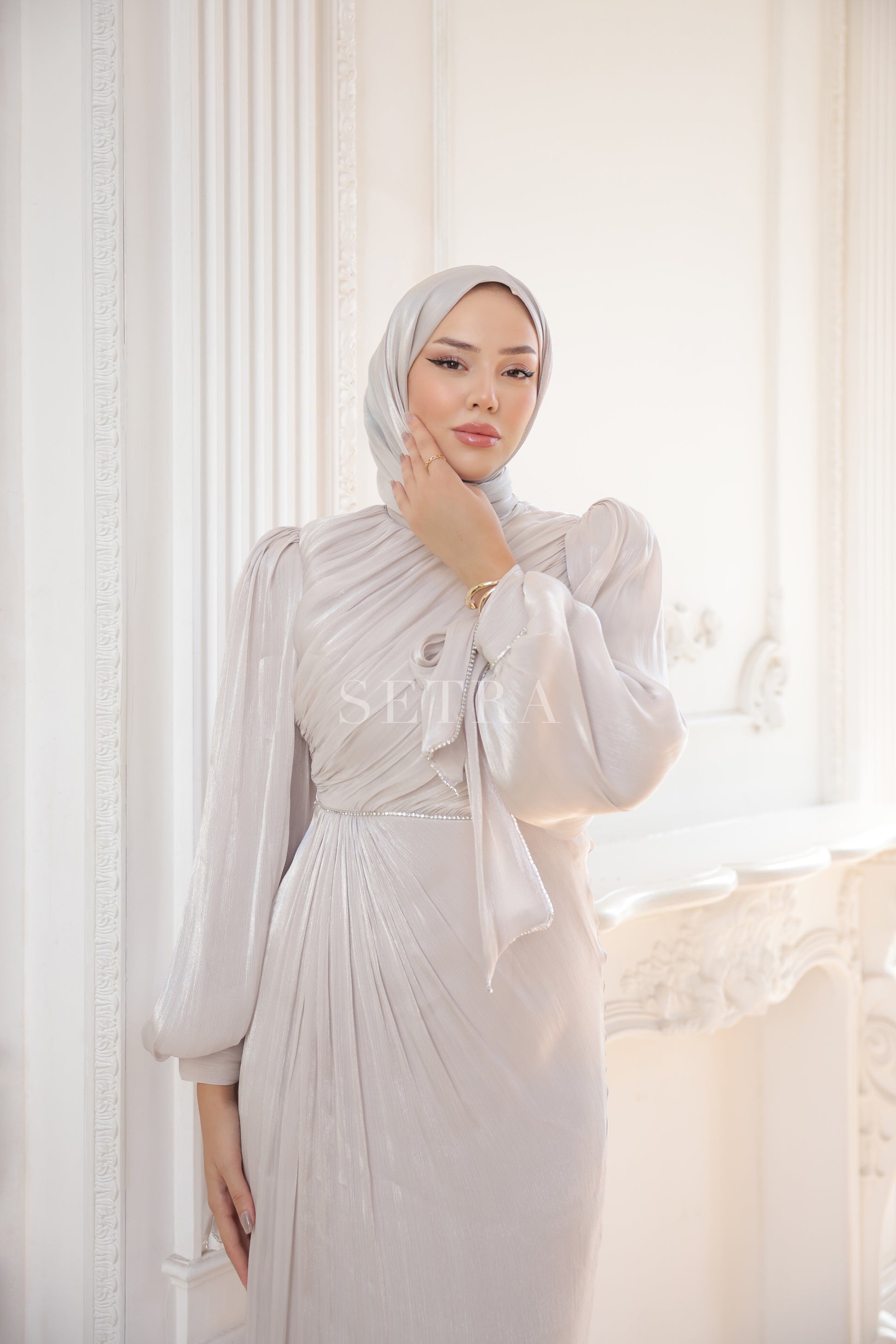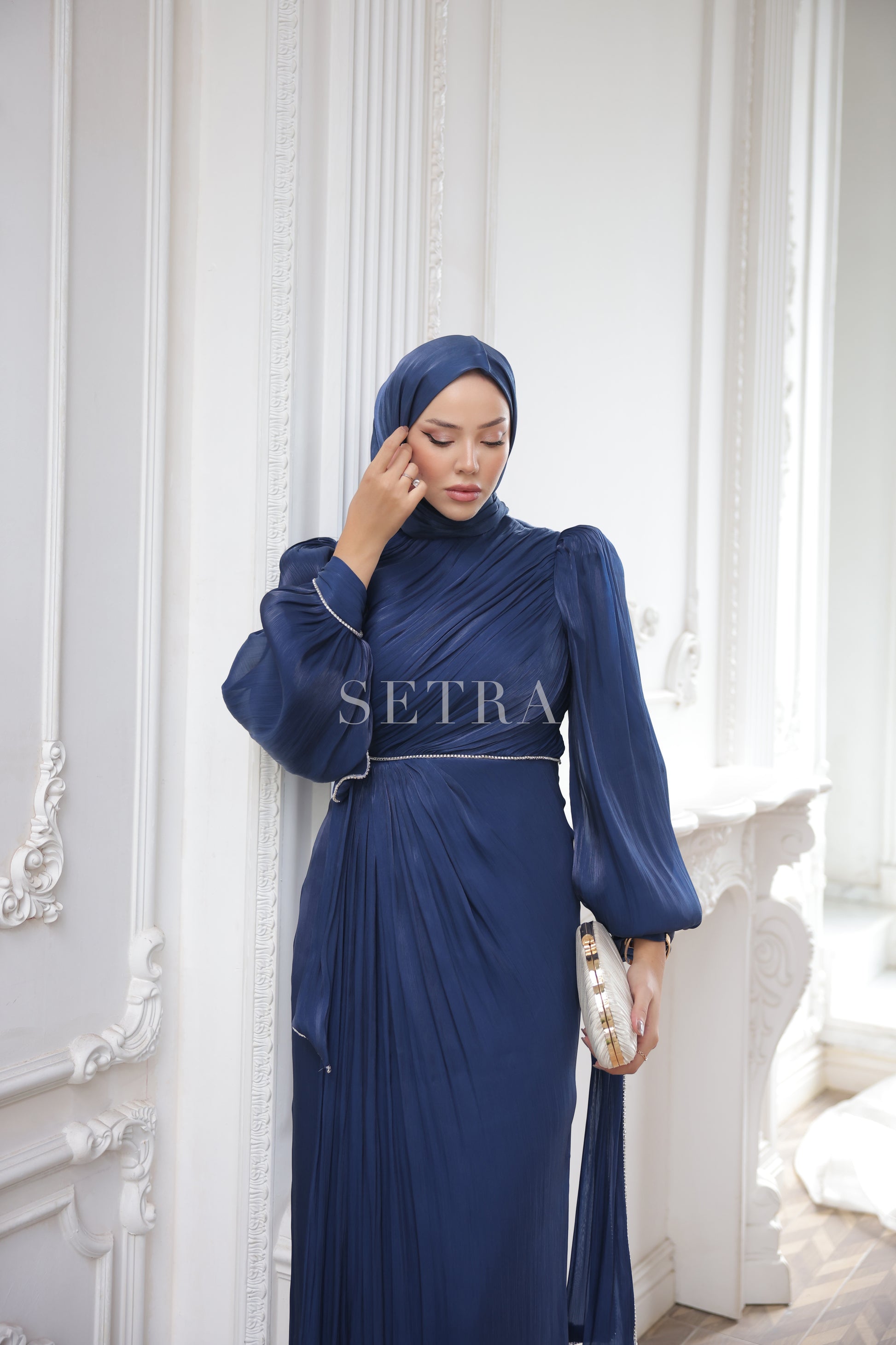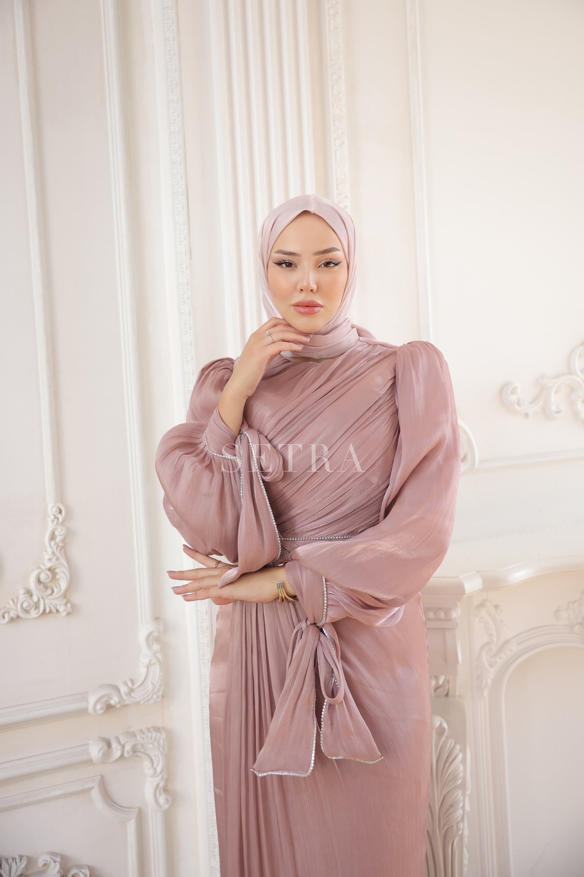 Şıklığı ve konforu bir araya getiren bu tesettür abiye elbise, özel günleriniz için zarif bir tercih sunuyor. Pileli ve akıcı kumaşı modern bir görünüm sağlarken, bel kısmındaki kuşak detayı vücut hatlarını zarifçe ön plana çıkarıyor. Uzun kollu ve kapalı yaka tasarımıyla tesettür modasına uygun olan bu abiye, düğün, nişan, davet ve tüm özel kutlamalarda stilinizi tamamlayacak göz alıcı bir parçadır.