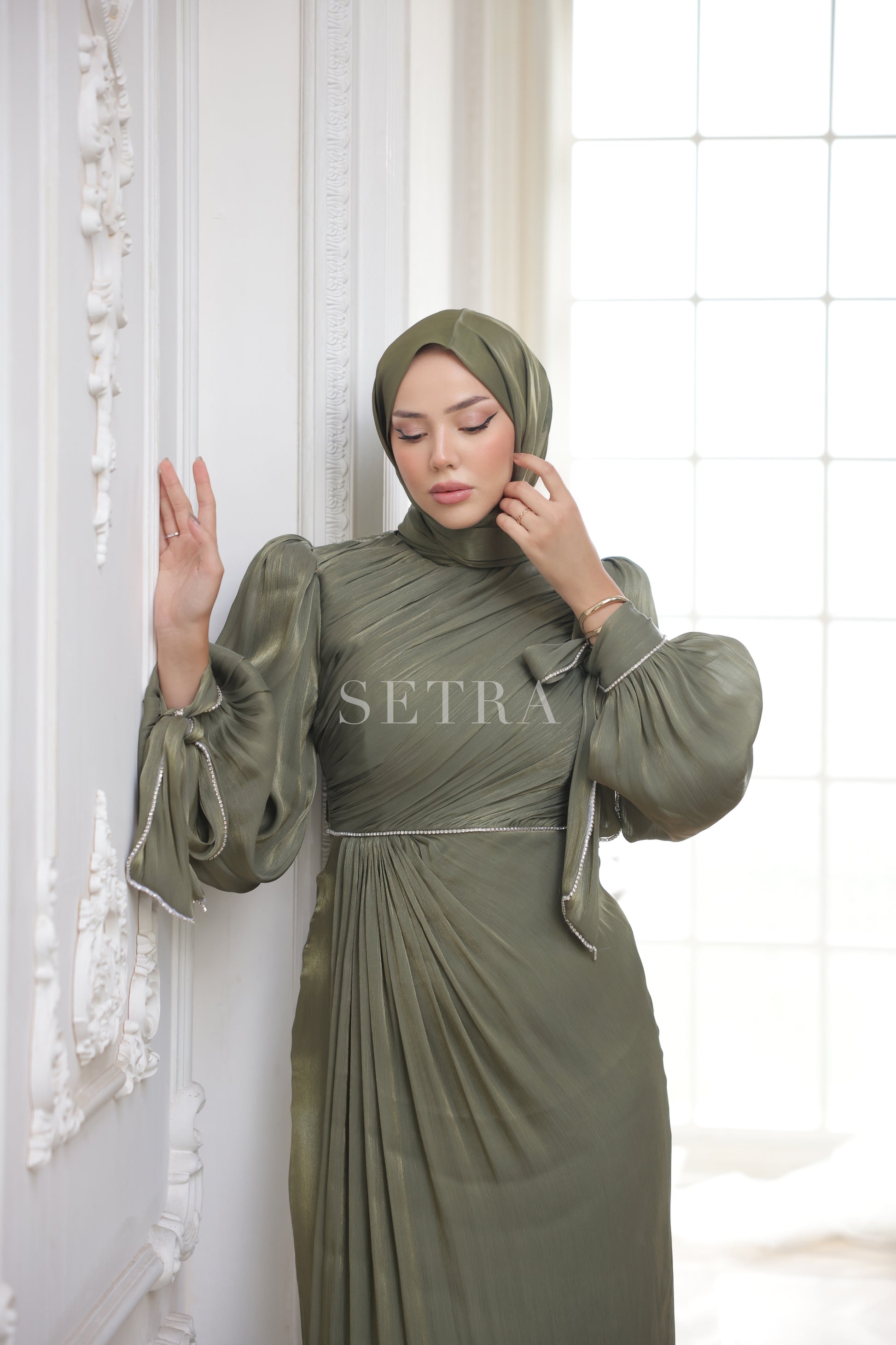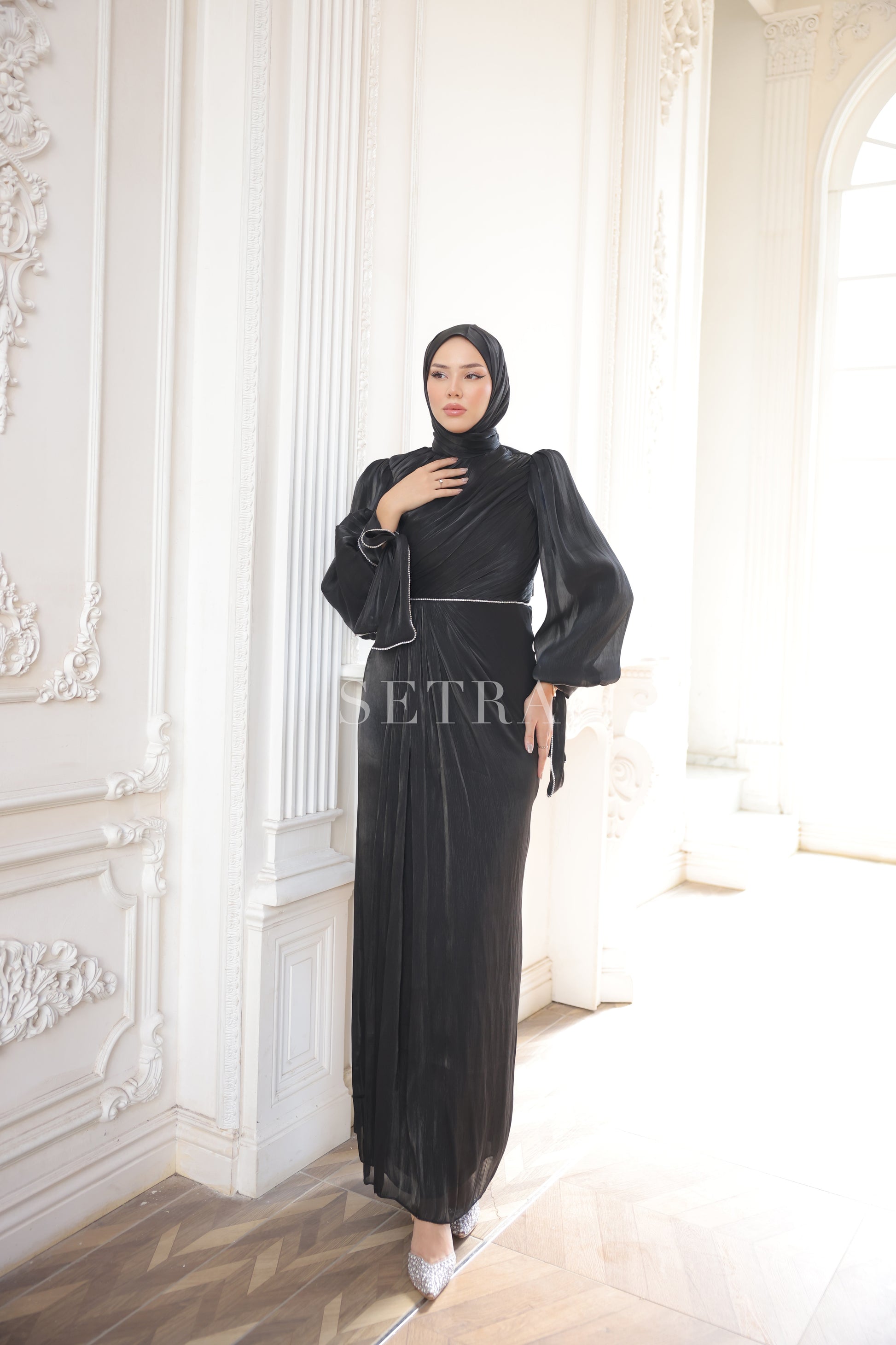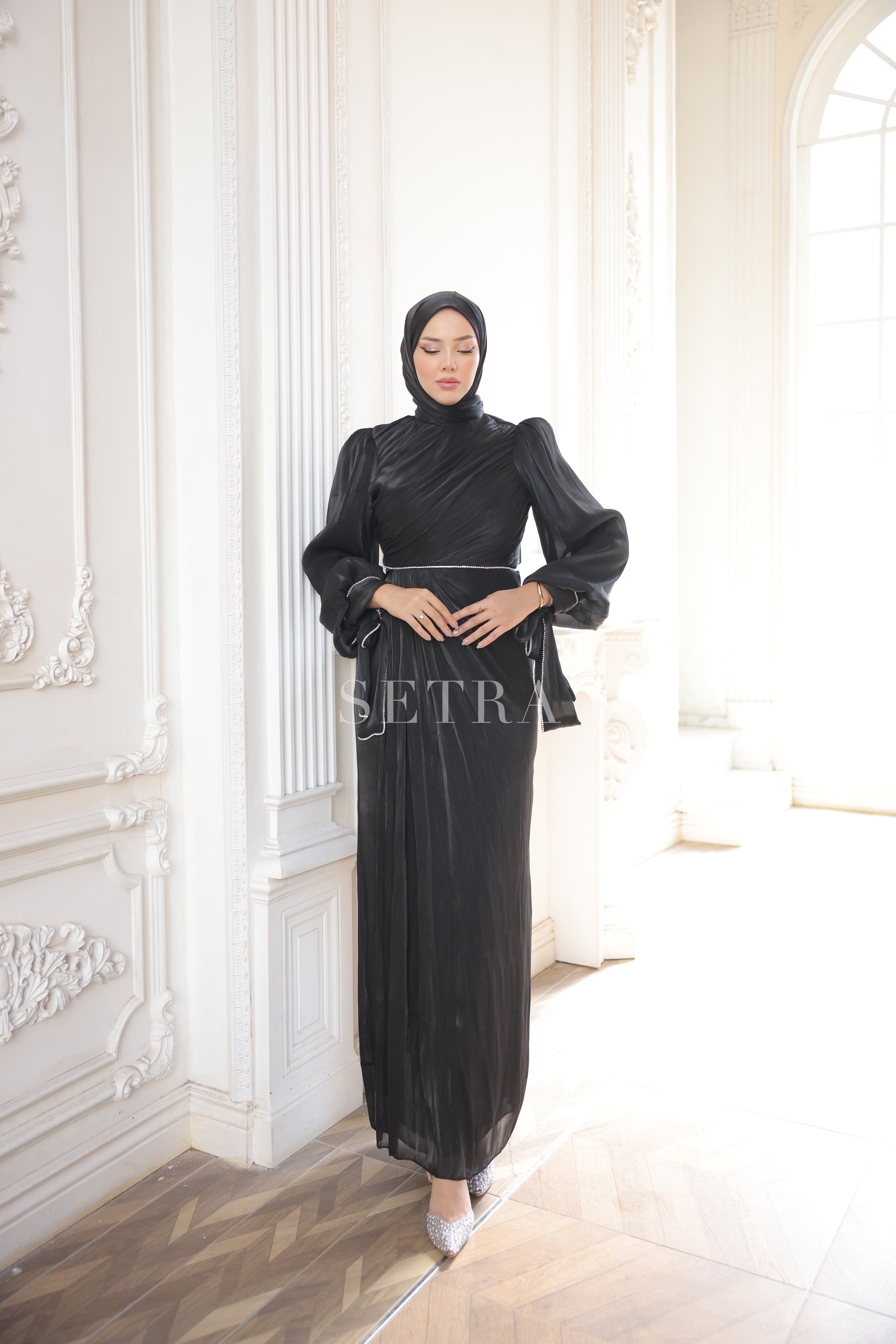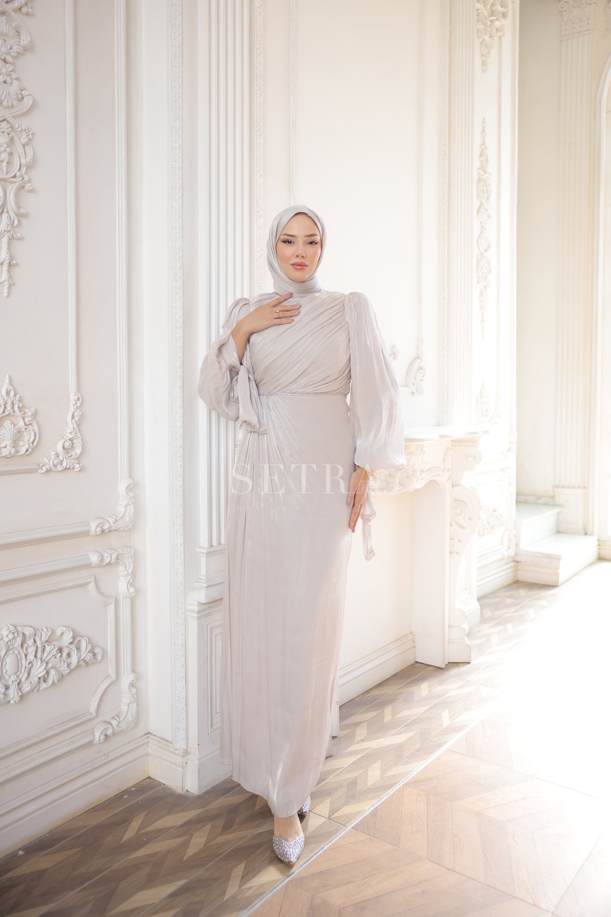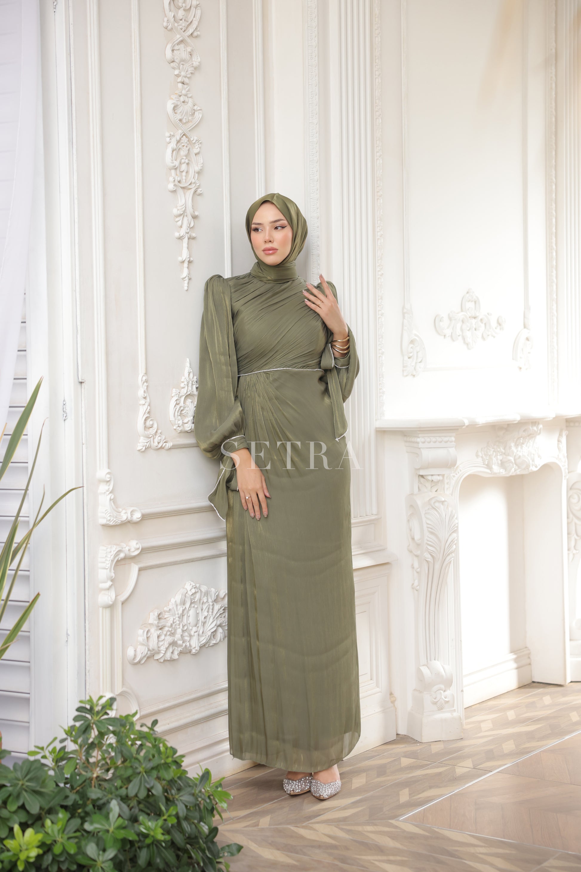 Şıklığı ve konforu bir araya getiren bu tesettür abiye elbise, özel günleriniz için zarif bir tercih sunuyor. Pileli ve akıcı kumaşı modern bir görünüm sağlarken, bel kısmındaki kuşak detayı vücut hatlarını zarifçe ön plana çıkarıyor. Uzun kollu ve kapalı yaka tasarımıyla tesettür modasına uygun olan bu abiye, düğün, nişan, davet ve tüm özel kutlamalarda stilinizi tamamlayacak göz alıcı bir parçadır.